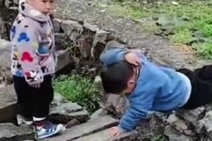 兄弟俩遇到宽沟,哥哥趴下用身体为弟弟搭桥